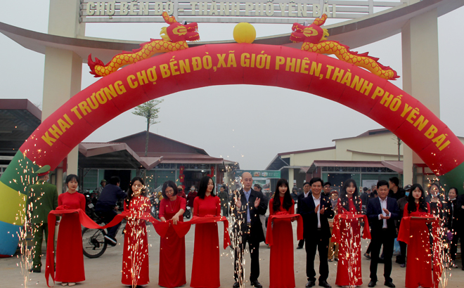 Lãnh đạo thành phố Yên Bái cắt băng khánh thành chợ Bến Đò.